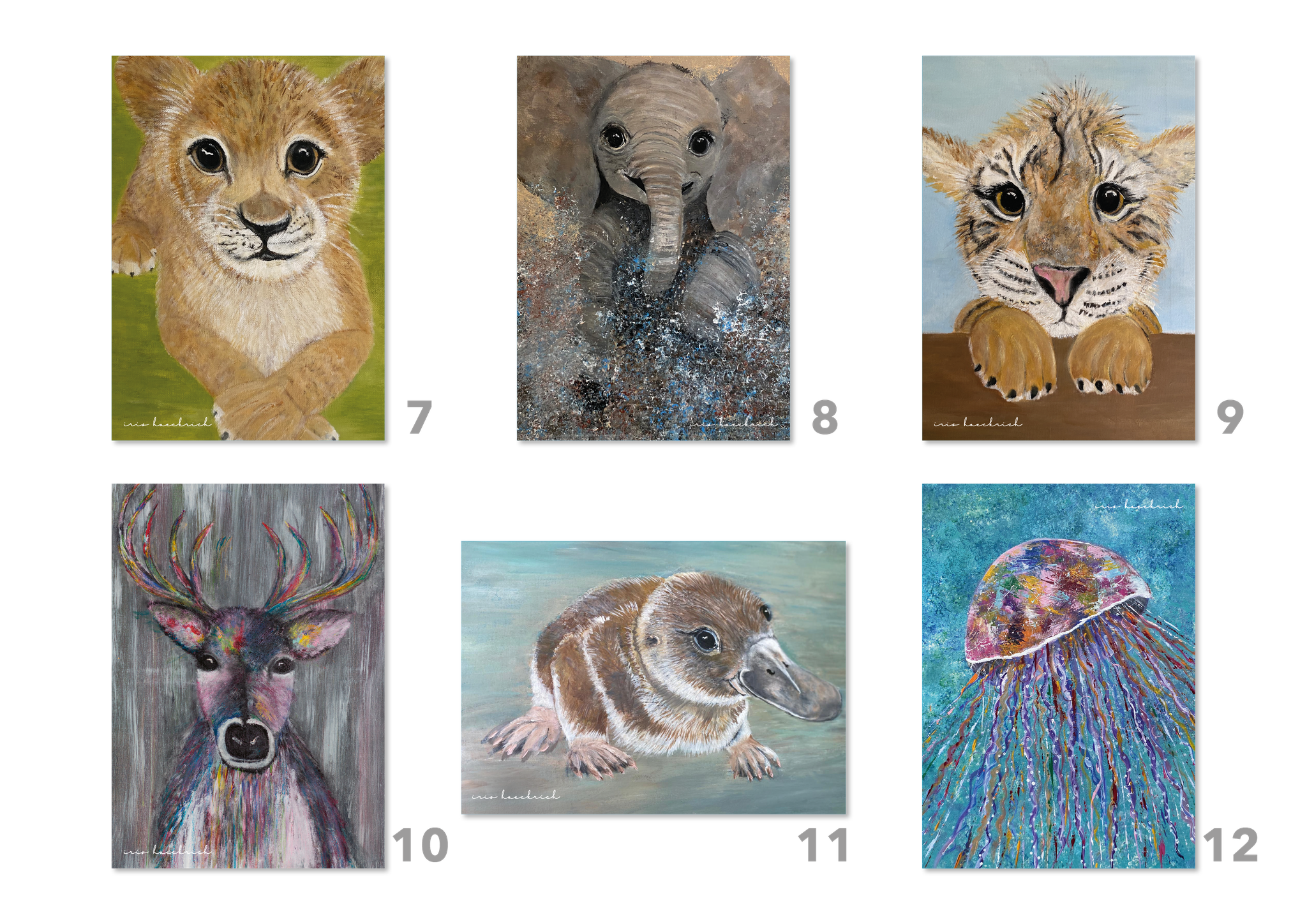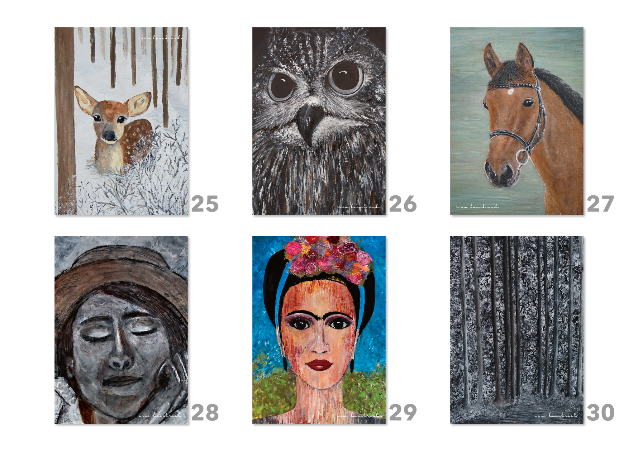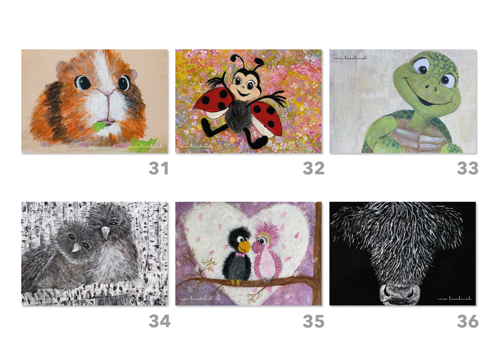 Du kannst aus meinen vielen Postkarten 10 Motive frei wählen. Die entsprechenden Nummern stehen neben den Bildern in der Galerie. Schreib mir ins Bemerkungsfeld im Bestellvorgang, welche Nummern es sein dürfen.